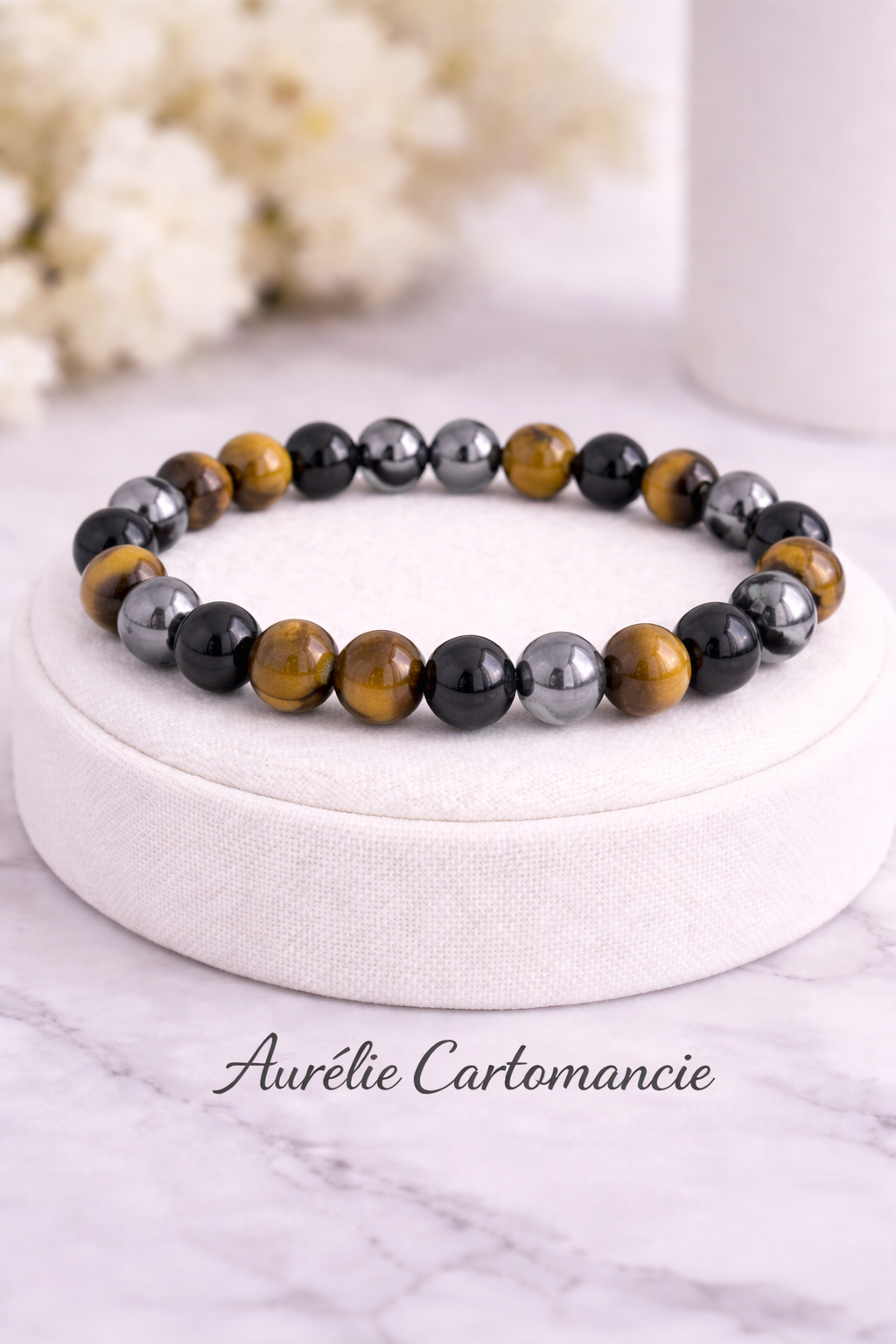 œil de tigre, hématite, tourmaline 8mm